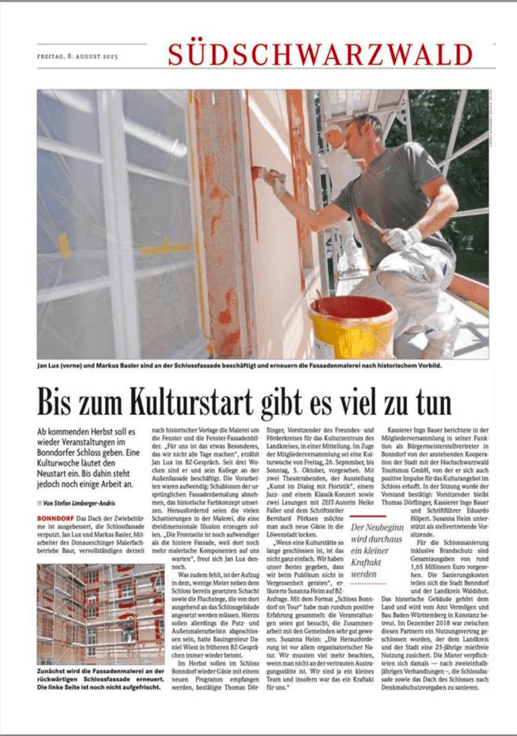 Insgesamt ist der Bauingenieur mehr als zufrieden mit dem Verlauf der Sarnierung. Und von dem Ergebnis an der Fassade ist er geradezu begeistert: „Wie man das jetzt sieht, entsteht ein Aushängeschild für den Landkreis“, urteilt er. Voll des Lobes ist Wiest unter anderem für die Arbeit des Malers, der die Verzierungen an den Gebäudewänden zu erneuern hatte – wan keineswegs eine triviale Aufgabe war: „Sieht richtig super aus“ , urteilt Wiest jetzt, „ein Glücksfall, dass das heute noch jemand
